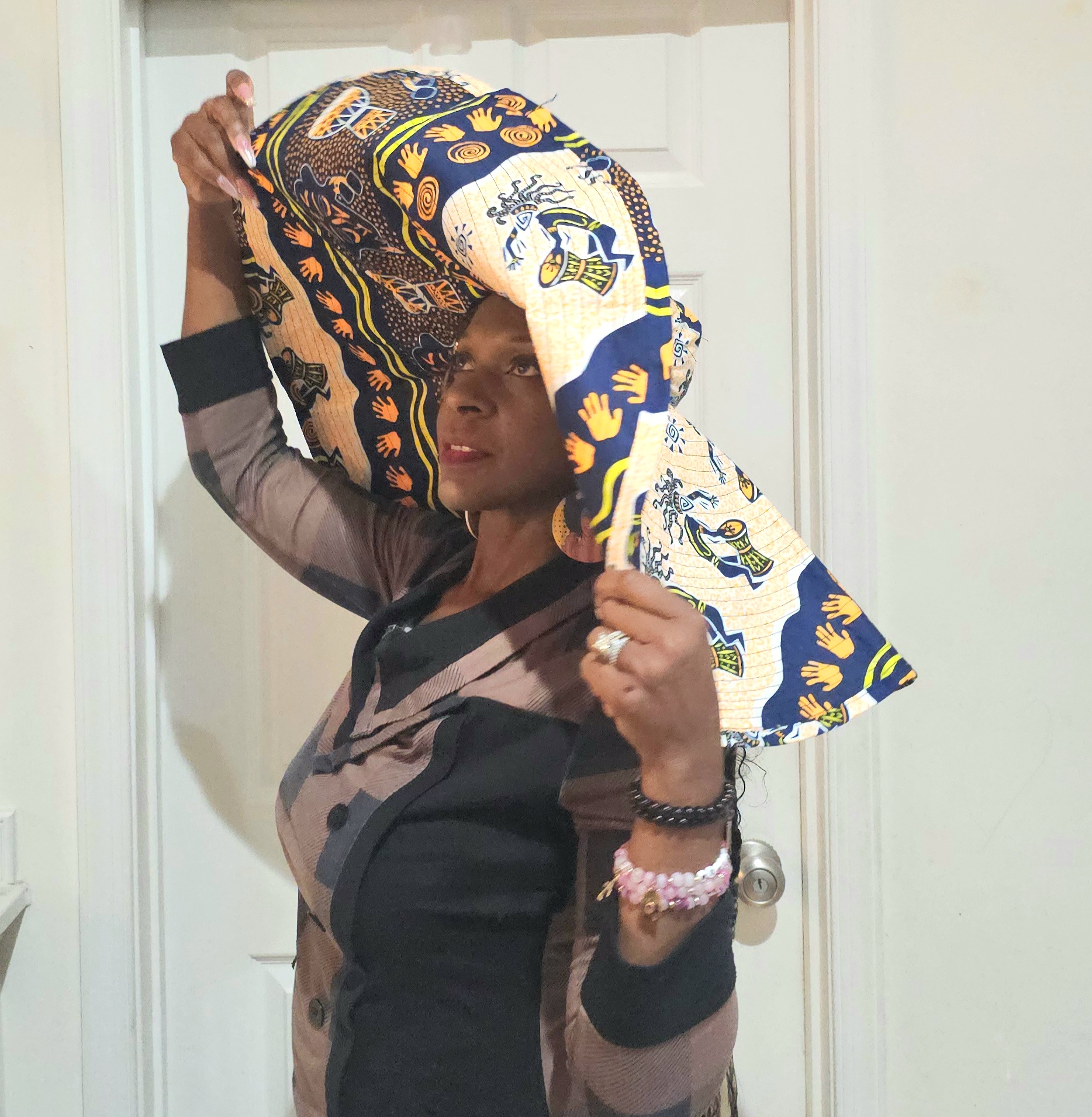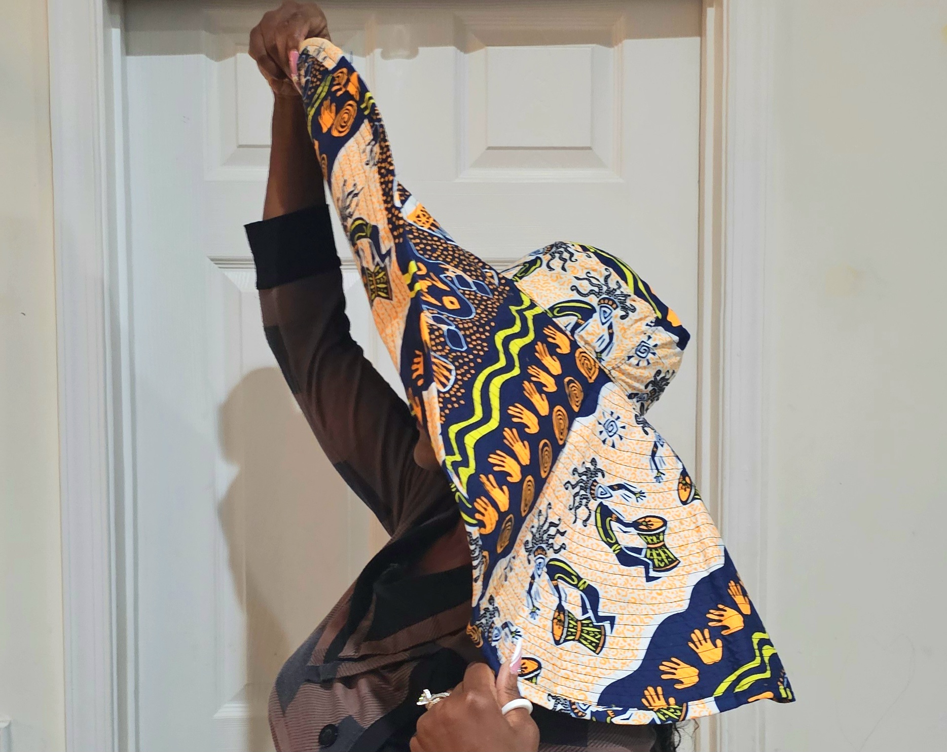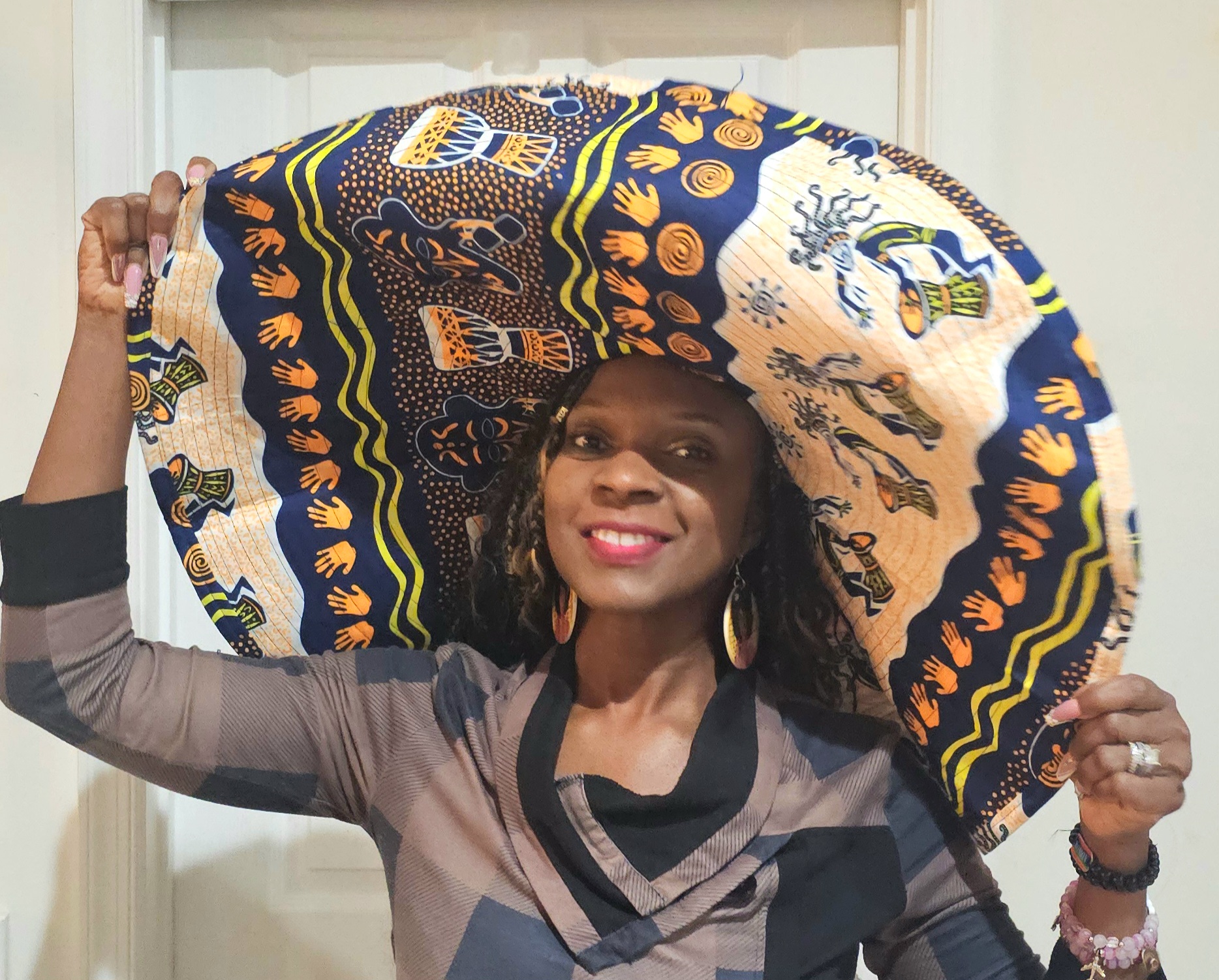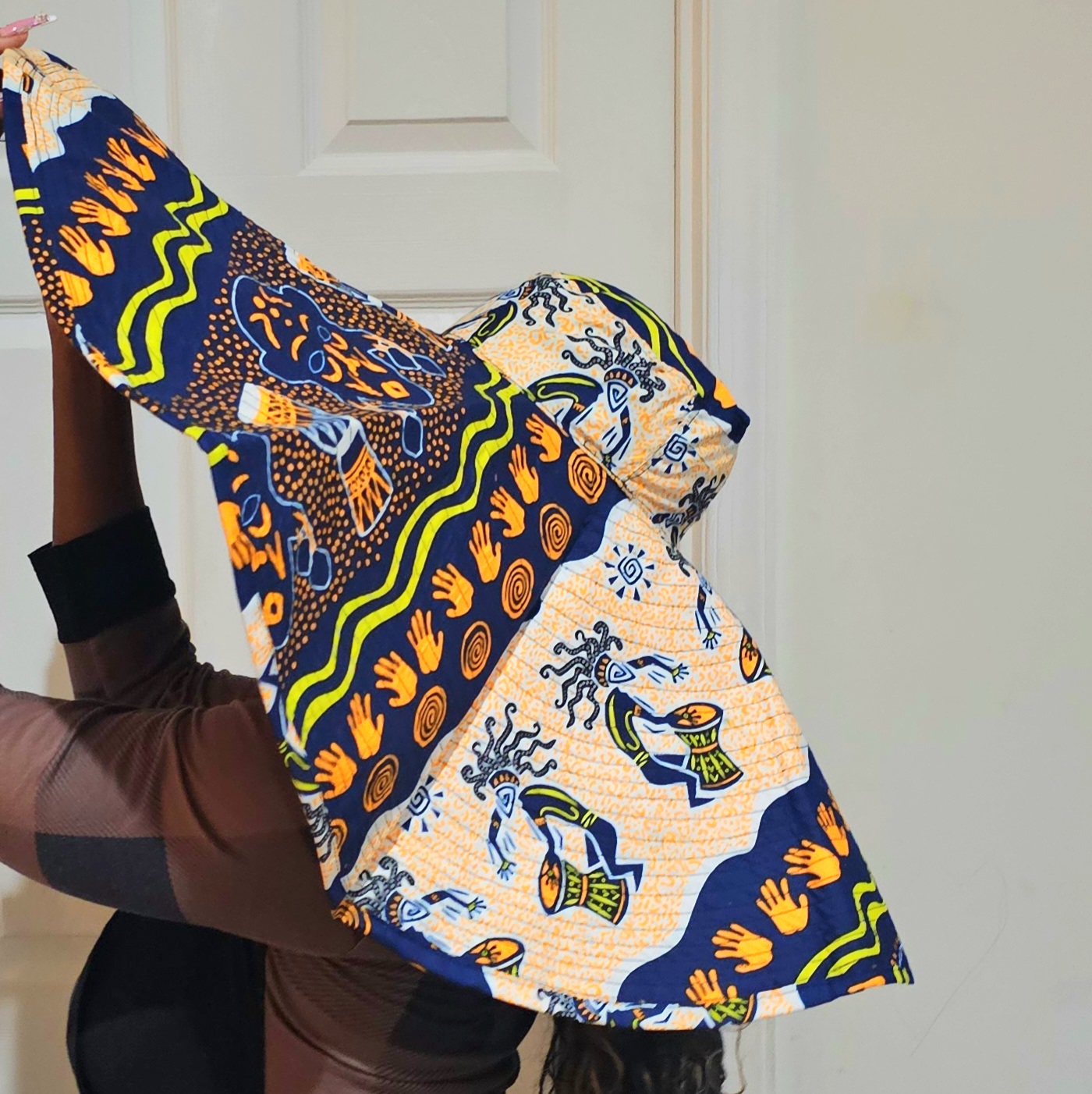 This oversized hat celebrates African art through its textile-inspired design. Featuring motifs of handprints, drums, and abstract figures in navy, orange, yellow, green, and white, it’s a wearable piece of culture. Ideal for fashion lovers who want heritage and creativity woven into their accessories.